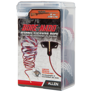 Discover unparalleled ease in firearm barrel maintenance with Allen revolutionary BORE-NADO barrel cleaning rope. Achieve a spotless barrel by simply applying a touch of your preferred barrel and bore cleaning solvent to the rope and executing a single stroke cleaning action that effectively clears your barrel from breach to muzzle. For an immaculate finish, repeat as needed. The rope's small end features a weighted brass bore guide, ensuring effortless maneuvering through your firearm. Utilizing advanced vortex bristle technology equipped with copper brushes, the rope adeptly eliminates fouling and debris as it passes through the barrel, while the integrated braided swab efficiently sweeps it away. Whether for quick clean-up tasks or seamless integration into your comprehensive cleaning regimen, this cleaning rope is a versatile companion, fitting perfectly in your range bag or gun case.