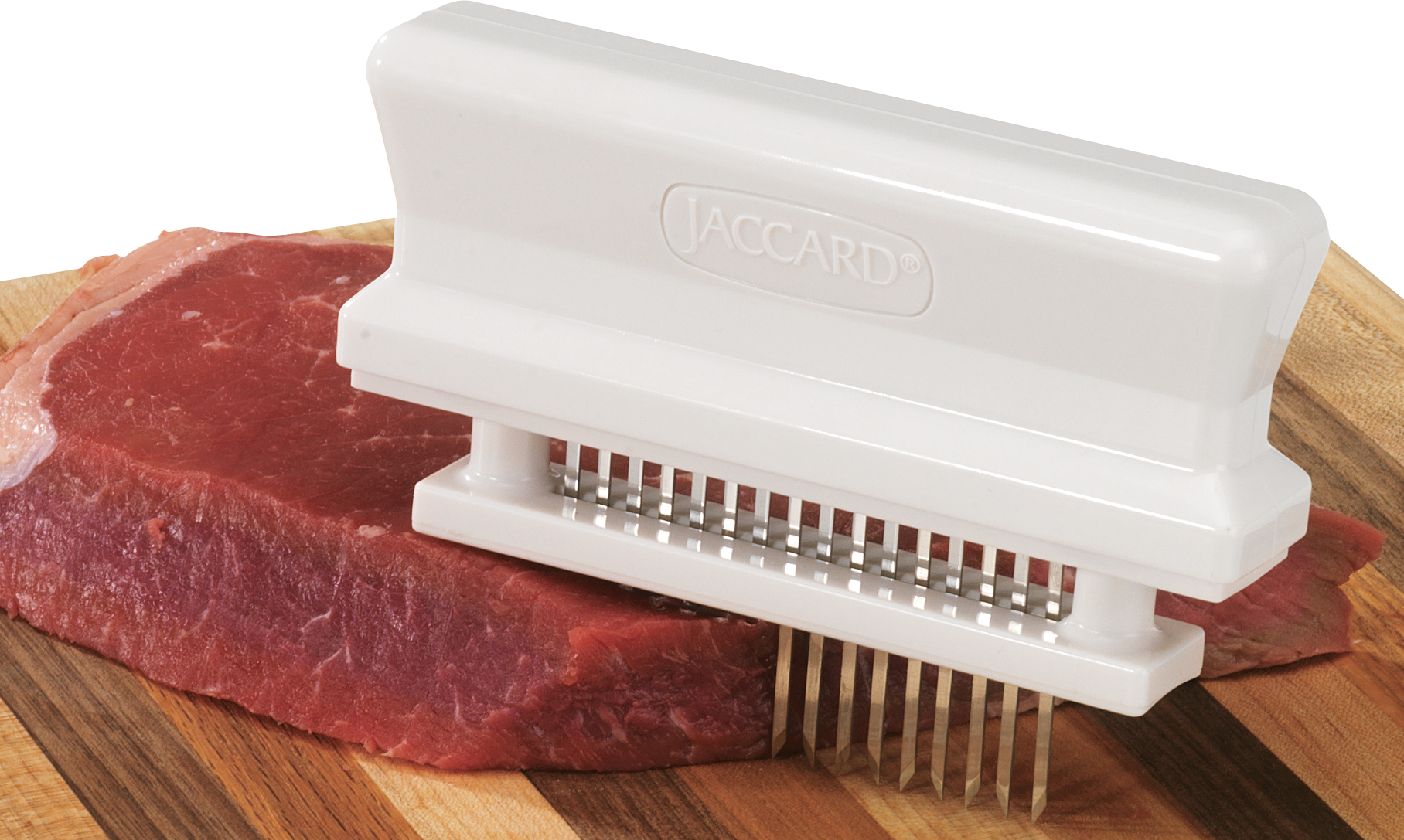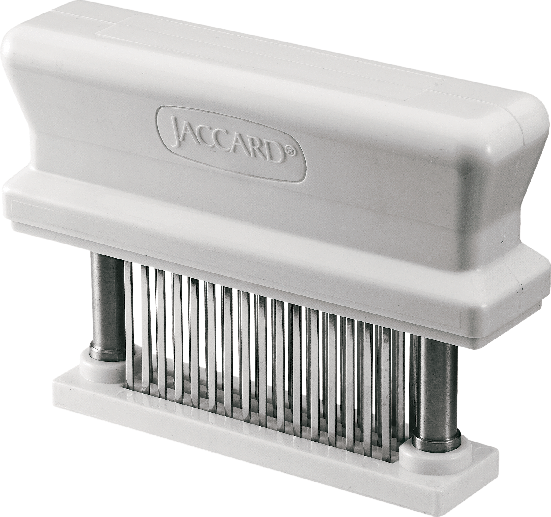 Jaccard Super Tendermatic Meat Tenderizer White 5 5/8in. x 4 1/8in. JC. The first product to market with patent pending technology that allows you to mechanically break down tough game like a club sandwich. This product has been developed and perfected by the inventor of a simple time tested method for tenderizing tough cuts of meat mechanically. The Jaccard Super Tendermatic Meat Tenderizer is a stainless steel manual tenderizer that boasts the largest variety of knife configurations of any tenderizer on the market. It includes six of the finest stainless steel implements and is fully adjustable to fit most meats both large and small. The patent pending technology allows you to easily tenderize beef chicken veal turkey and game with the "shock and slice" tenderization process. With just a few strokes the stainless steel implements create tiny heat channels in the tough areas of your meat allowing marinades and juices to penetrate all the way to the bone. This allows more uniform cooking temperature control and allows more juices to be produced from smaller muscle fibers. Each "cutter" reduces cooking time by up to 40 percent. This allows your less expensive cuts of meat to become more tender and flavorful. Specifications for Jaccard Super Tendermatic Meat Tenderizer: Manufacturer: Jaccard Blade Material: ABS Handle Material: ABS Features of Jaccard Hand Held Meat Tenderizer: Used in homes around the world to make great meals easy. Achieve better cooking results from less expensive cuts of meat or enhance the flavor and texture of even the finest meats with the original multi-knife manual meat tenderizer. Razor sharp knife blades cut through connective tissues that can make meat tough. Simple to do this age old technique known as "jaccarding" makes more flavorful more tender meat Also helps to retain your meat's natural juices. Perfect for beef chicken pork veal turkey and game -- readily penetrating flavor deeper into your favorite cuts. Reduce cooking time by up to 40 percent while helping meats to cook more evenly. Improves yield and "plate coverage" by reducing shrinkage. Tiny "heat channels" are created resulting in faster penetration of marinades providing more even cooking throughout the meat and significantly reduced cooking times - all without changing the shape or appearance of your meat. Made of FDA compliant ABS and genuine 300 Series stainless steel metal components. Highest quality stainless steel results in sharper blades that will not dull discolor rust or change shape over time. Knives measure 50 RHC and are sharpened on both sides for prolonged performance that stays sharp - even after frequent use. Dishwasher safe (top shelf recommended). Package Contents: Jaccard Super Tendermatic Meat Tenderizer Jaccard JC200348: Super Tendermatic Meat Tenderizer White 5 5/8in. x 4 1/8in.