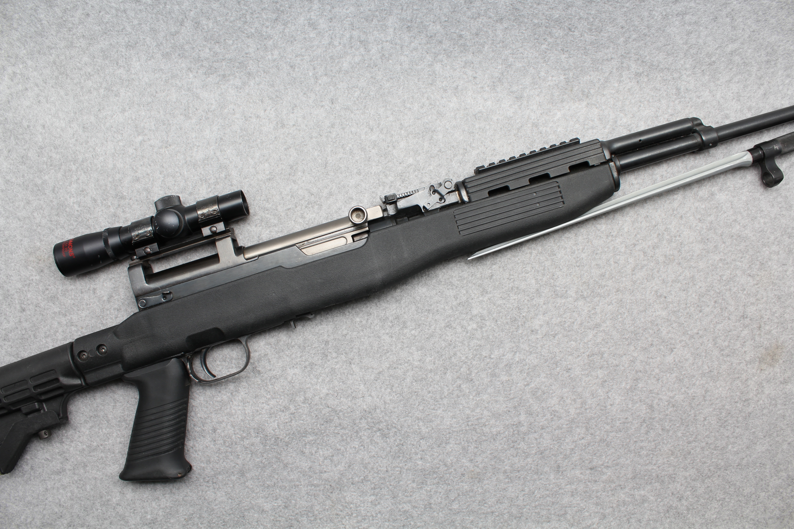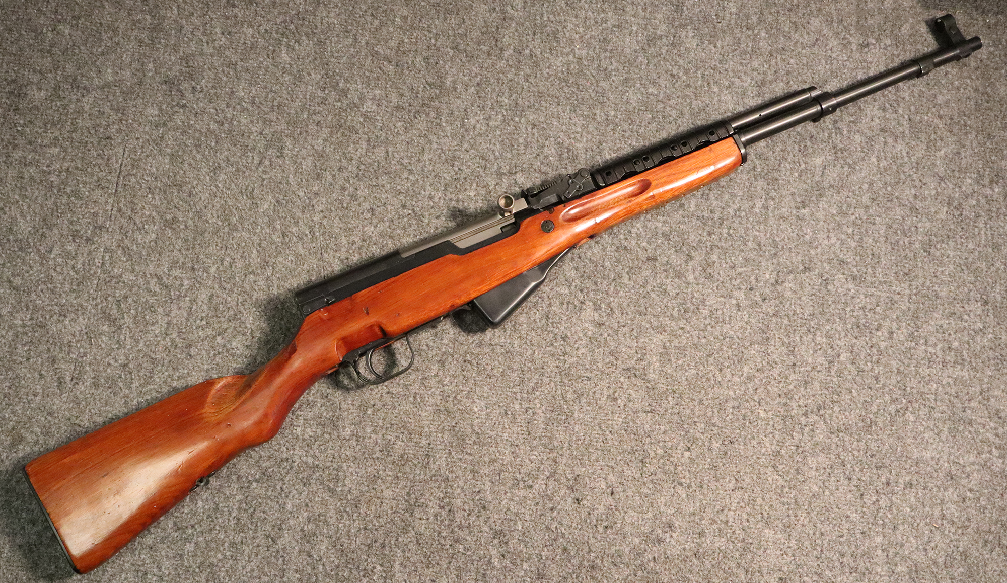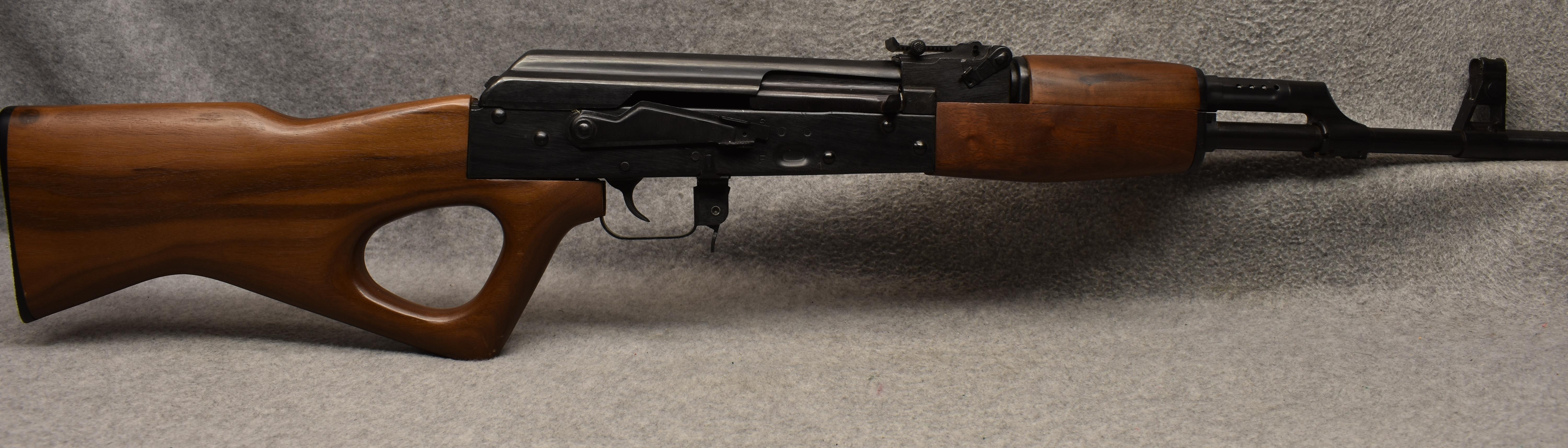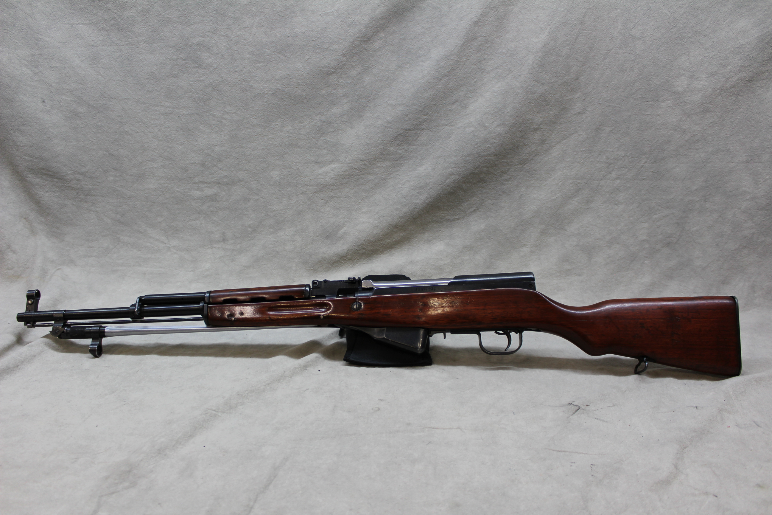 The Norinco SKS is a right handed semiauto rifle chambered in 7.62x39mm. This SKS in fed from a fixed box magazine. The bayonet lug on this rifle has been ground and was not refinished. This rifle is equipped with an aftermarket polymer stock and a Red Star brand 4x magnification scope. The metal on this rifle has some scratches and wear marks.