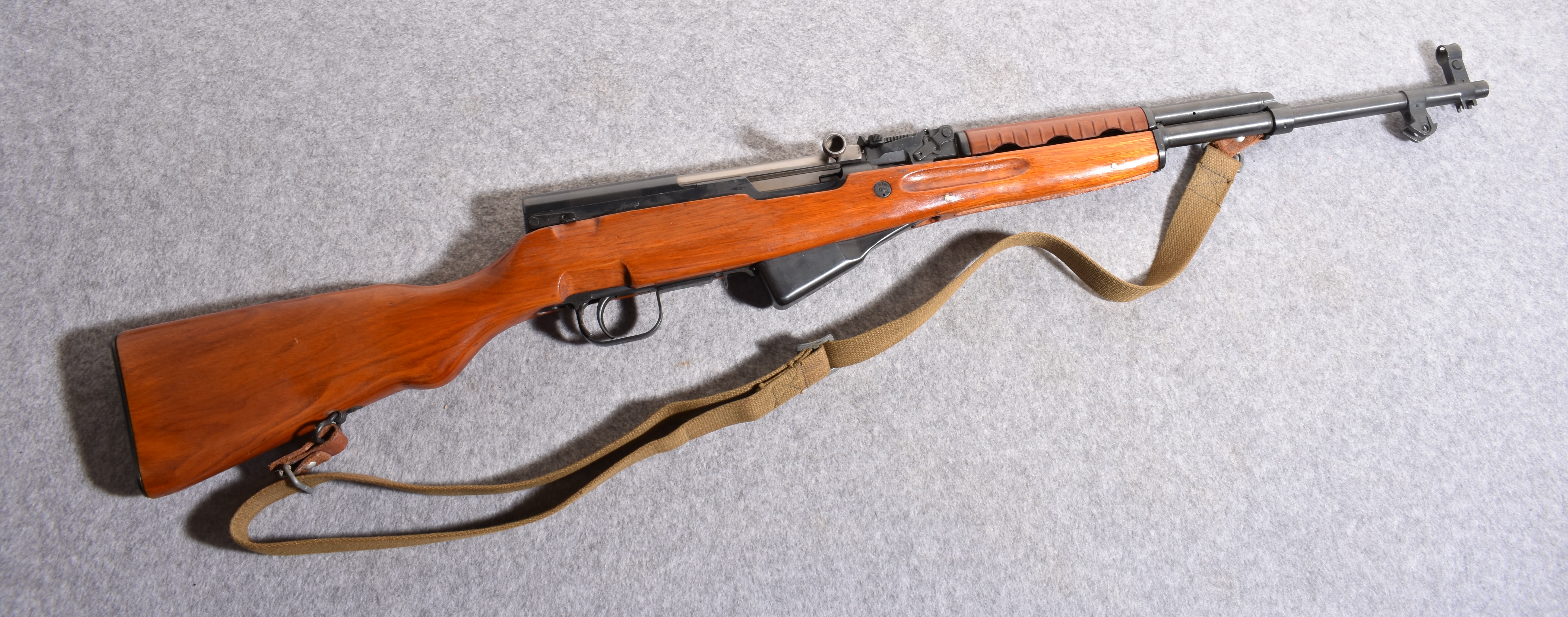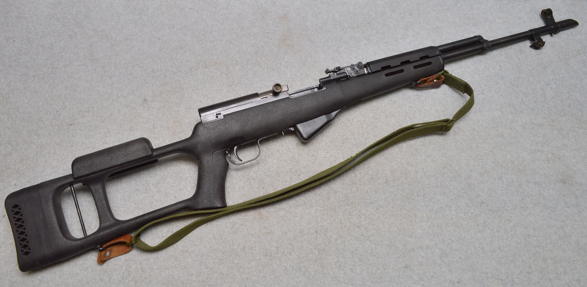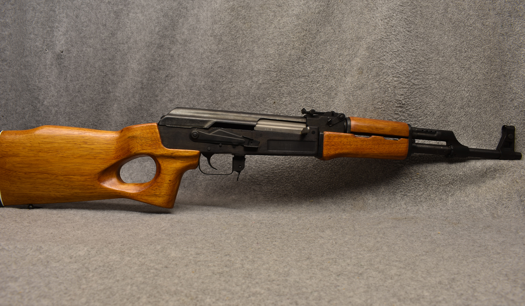 The Norinco SKS is a right handed semiauto rifle chambered in 7.62x39mm. This SKS in fed from a fixed box magazine. The bayonet lug on this rifle has been ground and was not refinished. This rifle is equipped with an aftermarket polymer stock and a Red Star brand 4x magnification scope. The metal on this rifle has some scratches and wear marks.