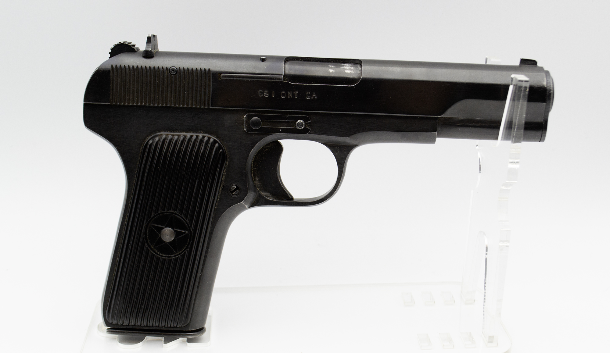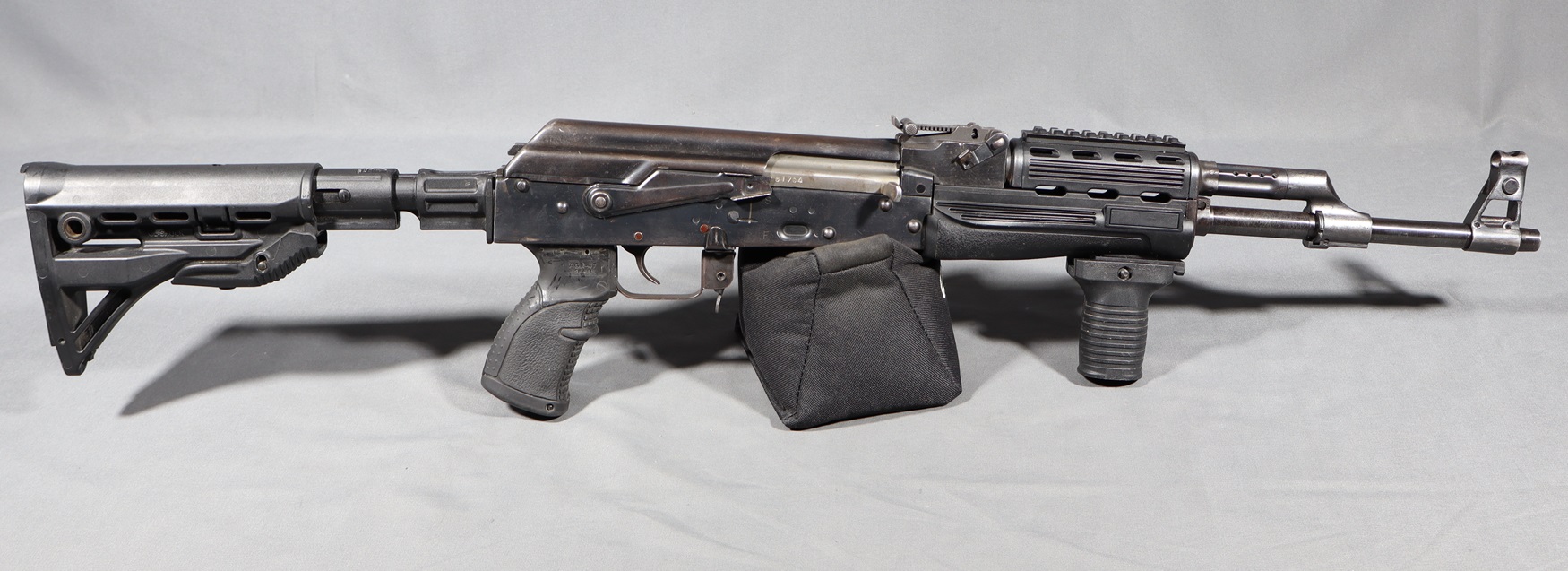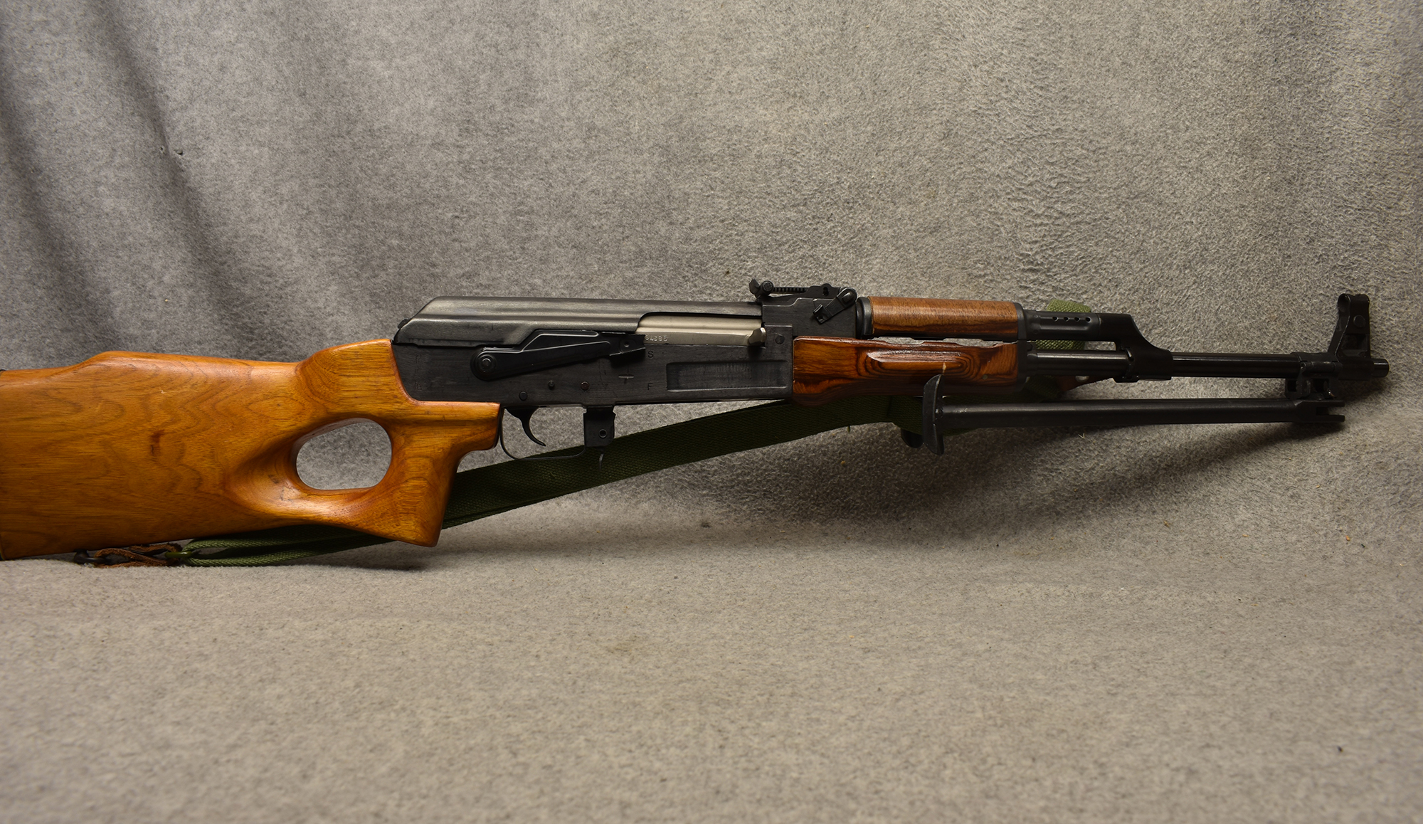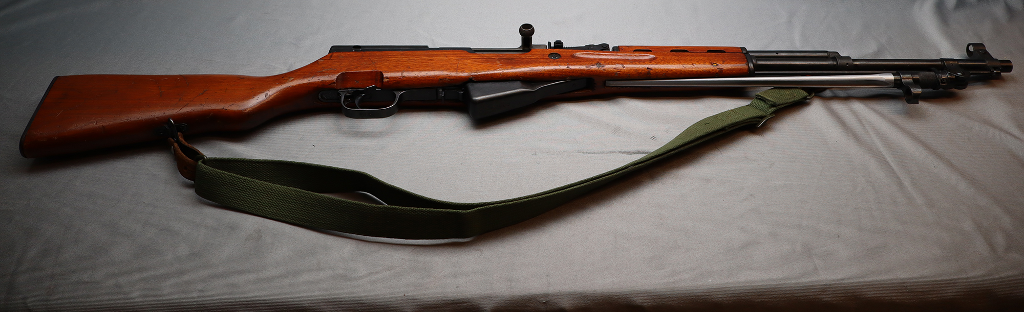 The Norinco SKS is a right handed semiauto rifle chambered in 7.62x39mm. This SKS in fed from a fixed box magazine. The bayonet lug on this rifle has been ground and was not refinished. This rifle is equipped with an aftermarket polymer stock and a Red Star brand 4x magnification scope. The metal on this rifle has some scratches and wear marks.