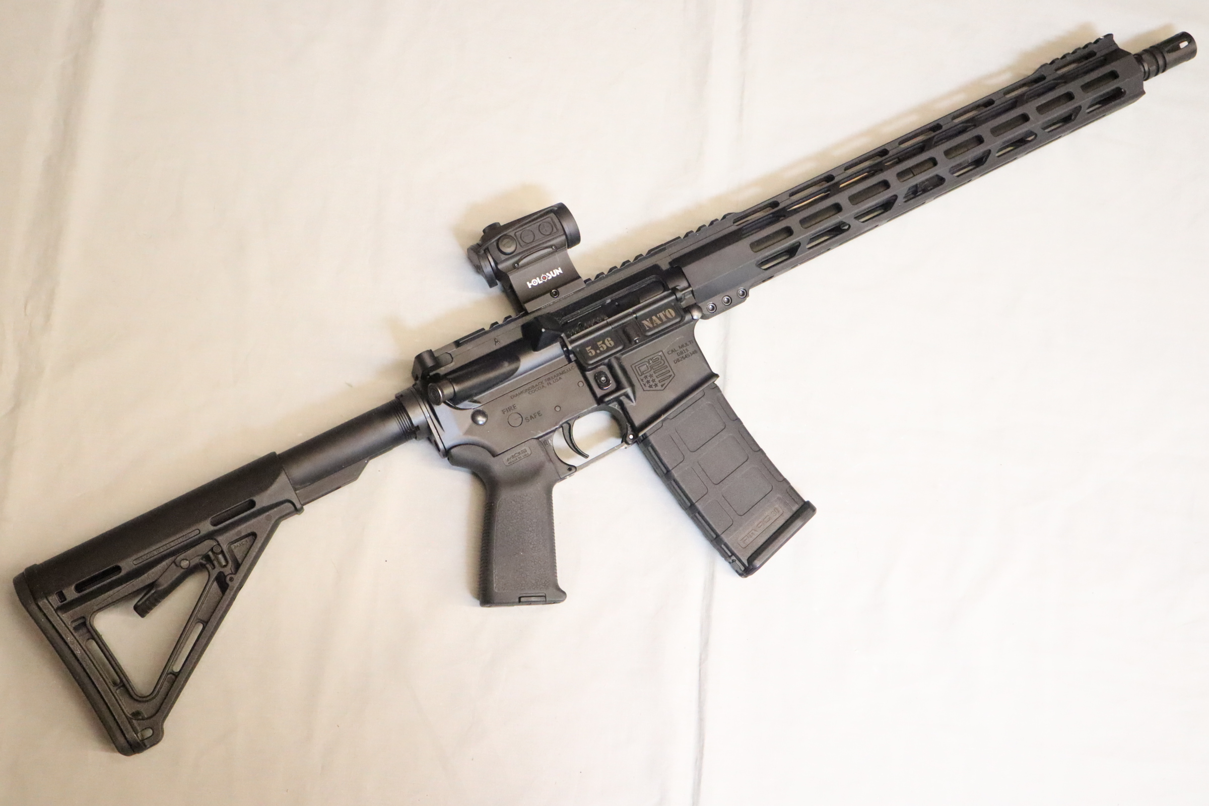Diamondback firearms db9r, tommy gun, semi-automatic, ar, 9mm, 16", black, cfp walnut tommy gun style ar-15 grip and foregrip, cfp walnut tommy gun style stock, 1:10, 50 rounds, 15" mlok rail, savior equipment ultimate guitar case db1480p001Action: Semi-AutoCaliber: 9mm LugerBarrel Length: 16"Capacity: 50+1Safety: Manual ThumbOal: 35.25"Stock Description: Wood Tommy Gun StyleMuzzle: Tommy Gun Flash HiderReceiver Material: 7075-T6 AluminumSights: Optic ReadyTwist: 1:10"Barrel Length Range: 16" to 16.99"Hand: Right HandStock Finish Group: Brown
