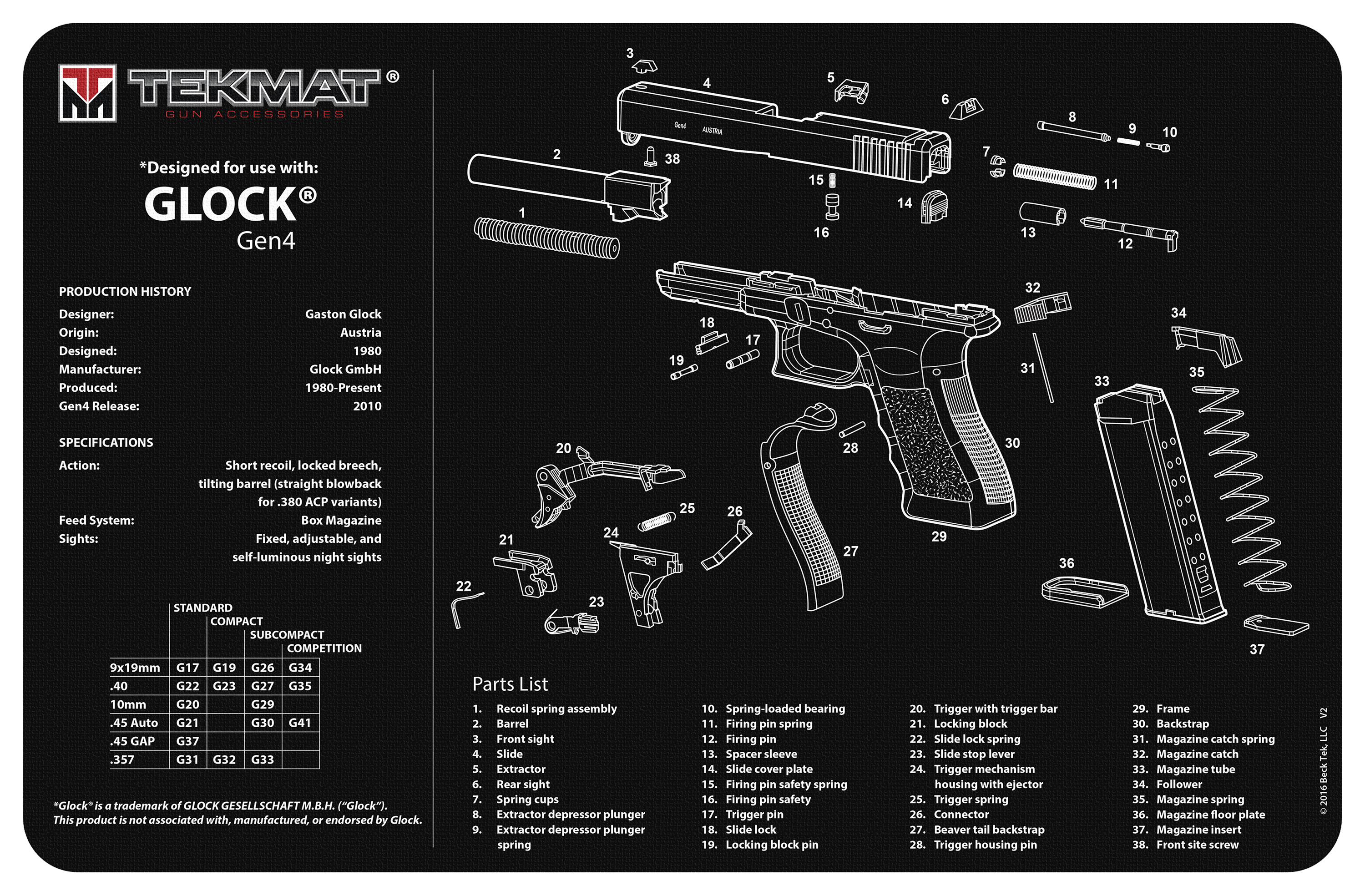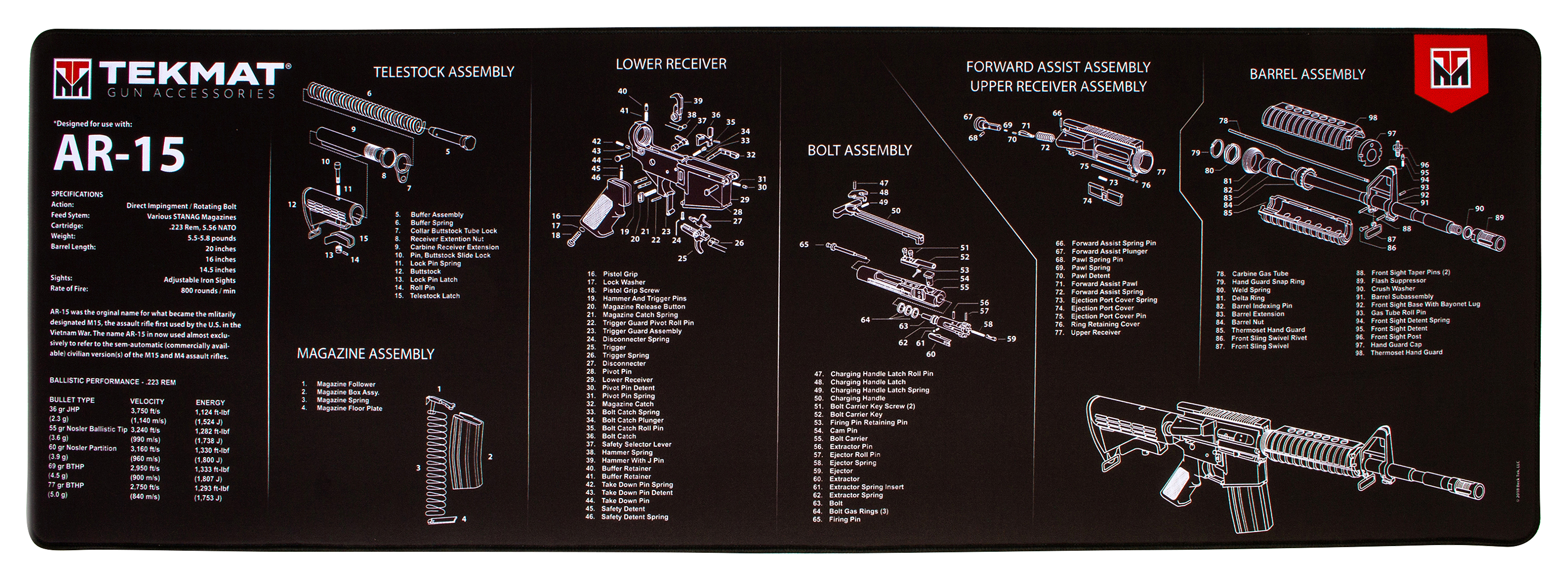 "Designed to provide a protected area to clean your rifle or shotgun, the TekMat Long Gun Cleaning Mat easily accommodates a fully disassembled long gun with room to spare for tools and accessories. 1/8"" padding provides extra protection from any rough handling or drops while working on your firearm, and protects your work area against abrasive solvents. Imported. Oversized to accommodate disassembled firearms 1/8"" PVC padding Protects your gun from drops and scratches Oil and water resistant Protects work area from abrasive solvents"