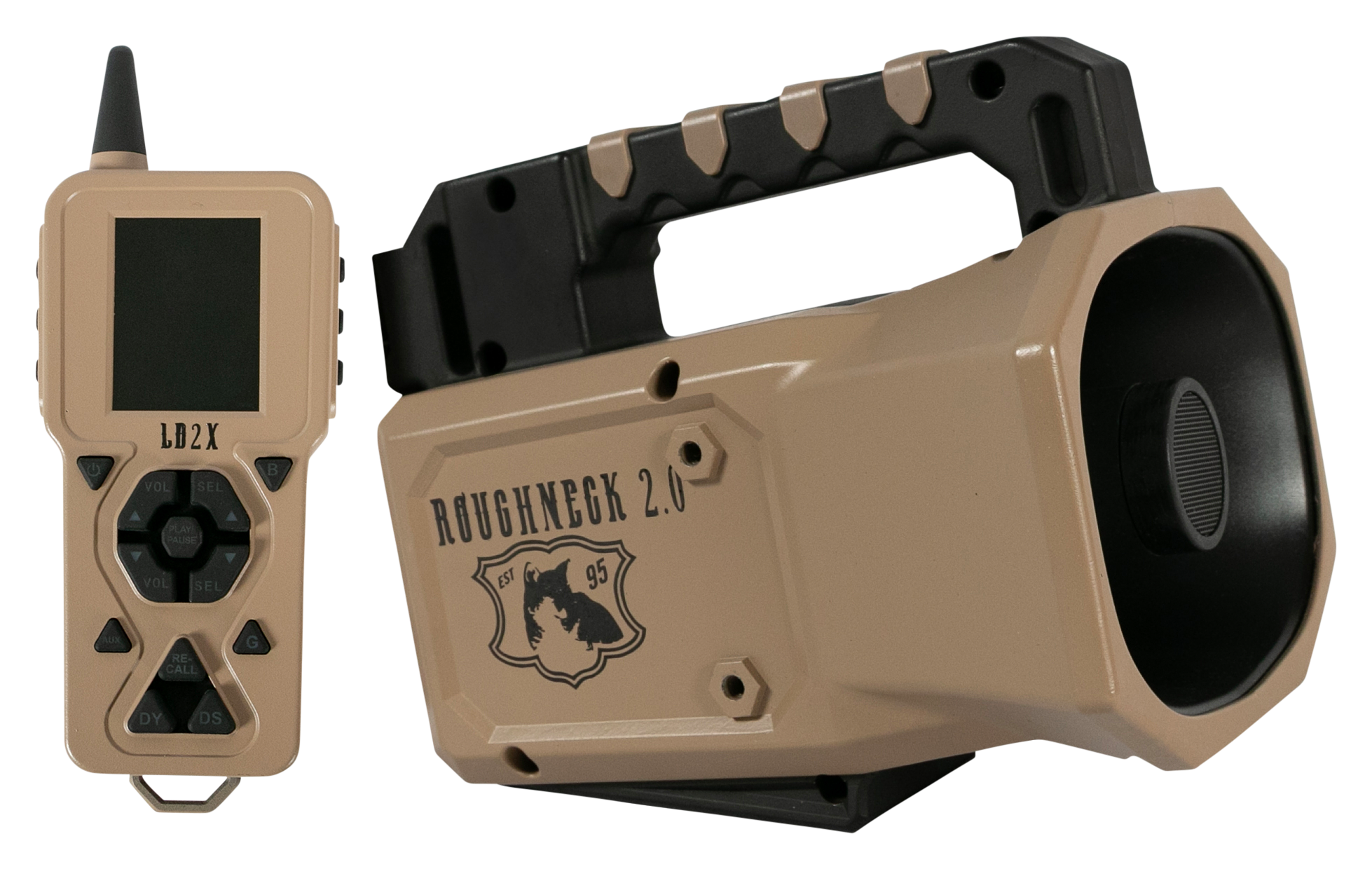 "Offering predator hunters everything they love about the original Revolt and more, the Lucky Duck Revolt 2.0 Electronic Predator Call System combines big sound with a motorized decoy. A high-output design, the Revolt 2.0 delivers unmatched sound quality and ear-piercing volume with its high-output speakers to reach far away predators. Unit sits on a remote-controlled rotational base and 6"" tripod to broadcast sound 360. This call system also features an integrated 3-speed motorized decoy that moves erratically to spur predators' curiosity to draw them in close. Convenient decoy design easily stores on the call for easy transport. Offering the capability to hold more than 2,000 calls, the Revolt 2.0 comes with 200 pre-recorded live animal sounds compiled by predator pro Rick Paillet. The included LD2XR remote features a LCD screen with day/dawn/night modes that utilize its 10 levels of brightness for easy reading at all hours of the day. The remote's extended range of 300+ yards lets you operate this high-performance caller far enough away to stay out of sight. Backlit buttons make low-light or nighttime operation a breeze. Runs on 10 AA batteries (not included). Remote runs on 3 AA batteries (not included). Comes with carry bag for easier transports and storage. Tough, updated housing. Mfrs. 5-year warranty. Big sound and decoy movement from an electronic predator call system High-output speakers - great sound quality and ear-piercing volume Rotating base on 6"" tripod - broadcasts sound in 360 Integrated 3-speed motorized decoy Comes with 200 pre-loaded sounds recorded by Rick Paillet Included LD2XR remote with LCD screen - 300+ yard range Day/dawn/night modes with 10 levels of brightness Backlit buttons Runs on 10 AA batteries (not included) Remote runs on 3 AA batteries (not included) Carry bag included"